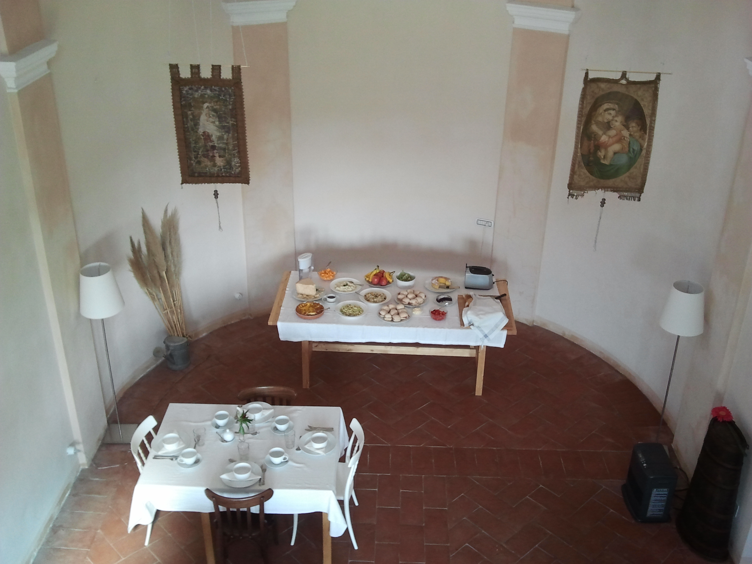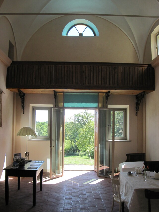 The lovely deconsecrated Church “Madonna della Grazie” and its stone patio are dedicated for guests to eat, relax, listen to music or use its kitchen to enjoy a cup of tea or glass of wine.                                                                                                                                                          A delicious full buffet breakfast with homemade farm products and fresh baking, served in the Church, is included in the room rates. The Cascina courtyard is a grassy tranquil garden area with chairs for outdoor relaxation — just perfect for reading and snoozing. Surrounding us are ten hectares of enchanting property, with marked paths leading through the forest and fields of wild flowers.